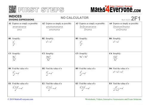 A worksheet on simplifying expressions with indices using the multiplication and division laws of indices. 5 5 5 5 5 5 5 5 5-----x x x x x x x-----Law 2 When dividing terms subtract the indices. Procure some of these worksheets for free.