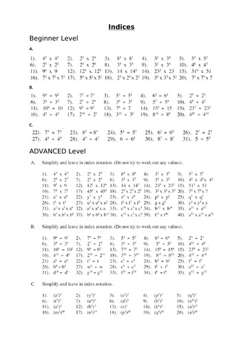 Indices Worksheet Differentiated Teaching Resources